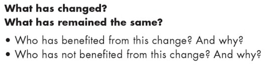 Chronology (or the order of events) is an important component of understanding the past. When looking at a timeline, historians don't simply find our when events happened or ideas emerged and why. It's essential to look at the big picture and figure out why and how things change, and also why and how things stay the same. This broader way of looking at the past involves the other thinking skills as well, especially considering the the change will effect different people in different ways.